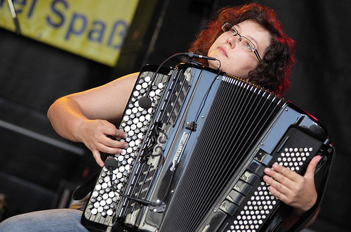 Das Akkordeon war das Hauptfach meines Studiums der Instrumental- und Gesangspädagogik von 1992-1996. Außerdem habe ich auf diesem Instrument auch den KA-Abschluß (Künstlerische Ausbildung) gemacht - ebenfalls in 1996. Begonnen habe ich mit dem Akkordeonspiel in 1980, spielte auf verschiedenen Wettbewerben und gewann unter anderem 1992 den "Musikpreis der Stadt Herborn", 1995 den "Deutschen Akkordeon-Musikpreis" und erreichte 1996 beim "Coupe Mondial" im Elsaß den 6. Platz. Mitten in meinem Studium sattelte ich vom Tasten-Akkordeon auf das chromatische Knopf-Akkordeon um, das bei uns seltener, in anderen Ländern aber um so weiter verbreitet ist. Es besitzt einen wesentlich größeren Tonumfang und erlaubt aufgrund der Anordnung eine größere Griffspanne.
